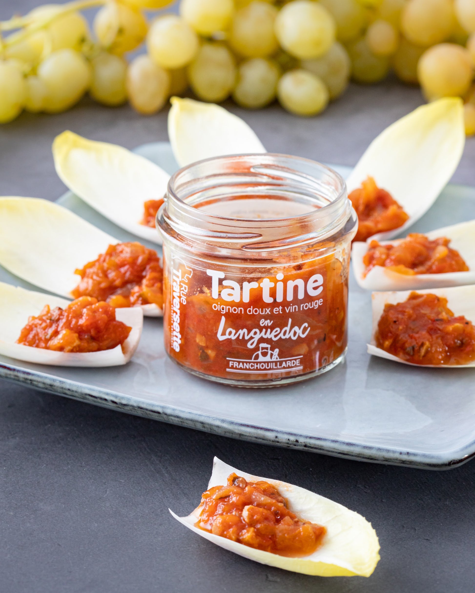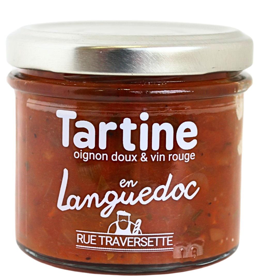 Oignon doux (51%), tomate, navet, amandes grillées, vin rouge (10%), huile d'olive, sel, raisin, estragon, thym, poivre, laurier